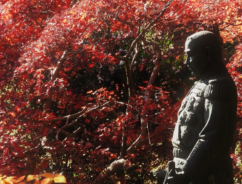 銅像を背景にした紅葉は、歴史の重厚さと自然のダイナミズムが融合した、唯一無二の景色を作り出します。
